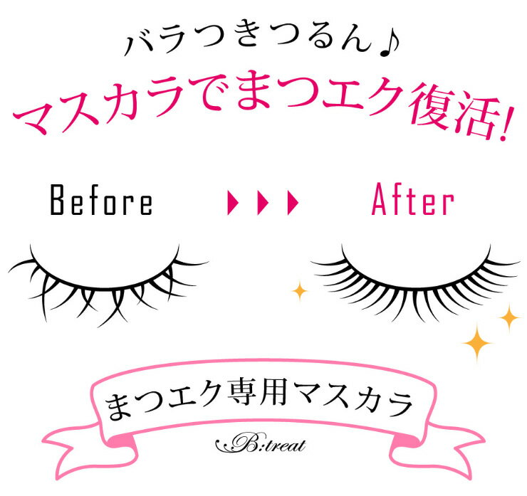 B:treat(ビトリート) まつエク専用マスカラマスカラでまつエク復活次のまつエクいつ行く?まつエク専用マスカラがあるからまだ大丈夫!バラついたまつ毛をキレイにセパレート【まつエク専用マスカラのポイント】◯ワイドタイプ三角ブラシ採用まつエクを引っかけずに毛流れをきれいに整え、まつ毛1本1本をきれいにセパレート!◯360度ホールド構造自まつ毛とまつエクを全方位カバーし、まつ毛1本1本をキレイにコーティング!◯ボリューム&上向きまつ毛へ2つのフィルムが、まつエクと自まつ毛をしっかりコーティング!目元にボリューム感を出して、さらにツルンと上向きに仕上げてくれます!【メイクするほど美まつ毛へ】8種類の美容成分配合で日中も自まつ毛ケア◯ハリ・コシを与える成分配合プラセンタカンゾウ根エキスビタミンE◯ツヤを与える成分配合スクワラン加水分解ケラチン◯うるおいを与える成分ローヤルゼリーメシマコブエキスパンテノール【なりたいイメージで選べるカラー】◯ブラックキリっと目元を引き締める定番色!◯ブラックブラウンふんわり優しい印象の目元にナチュラルに馴染む、少し濃い目のブラウン♪